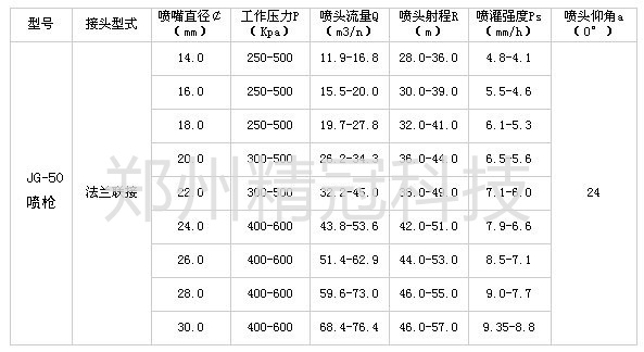 1.JG-PYC50喷枪是垂直摇臂喷头,该产品结构新颖,外形美观;工作压力损失小,运转平稳可靠,适合于喷灌配套,农田喷灌、煤厂、电厂除尘、城市绿化等需要喷洒的场合。